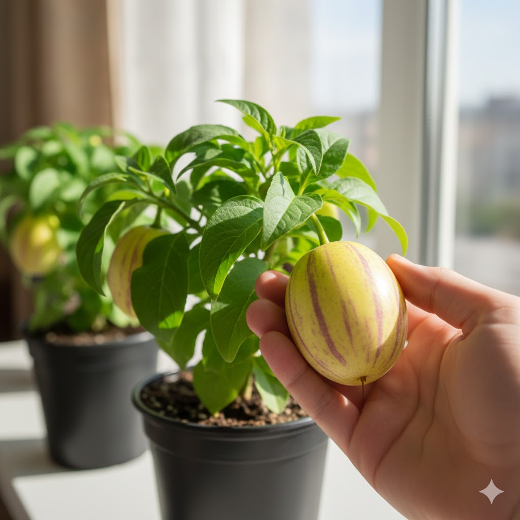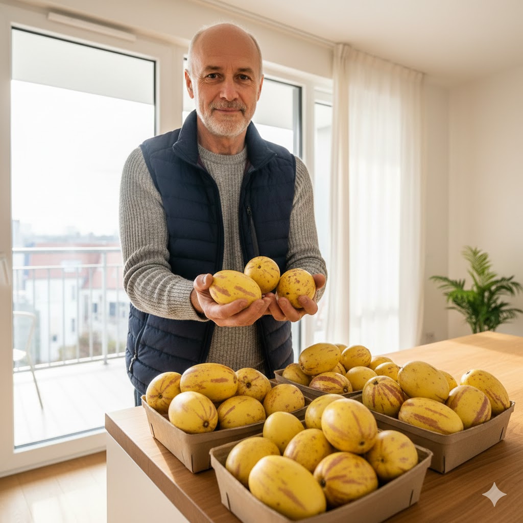 Чесно — не вірила, що пепіно може родити в квартирі. Але “Рума” здивувала. Перші плоди зняла ще минулого сезону, а цього року вже вдруге збираю. Стоїть на підвіконні, нічого складного не роблю — полив і світло. Плоди солодкі, реально смачні.